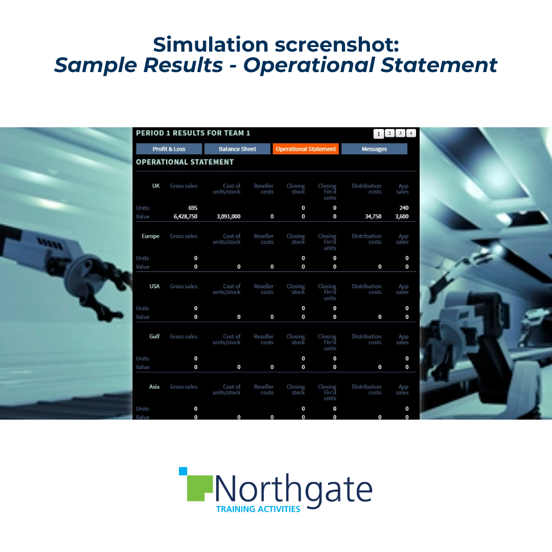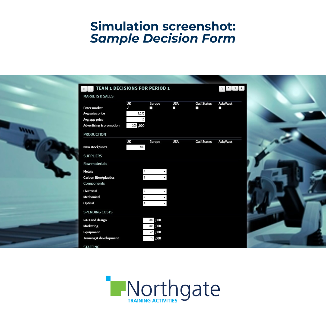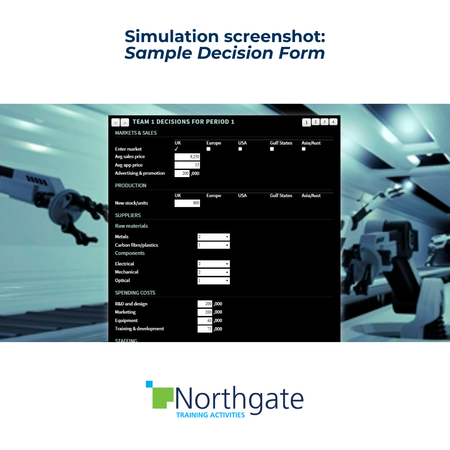 Teams take over the management of a robotics company. There are potential, new markets in Europe, USA, Gulf States and Asia Pacific. At each quarter of the simulation teams have the option to enter new regions, so what will they do? It’s important to establish a sound business model at home but timing is critical in this highly competitive industry sector. How much risk are teams prepared to take in order to gain an early foothold in vital new markets?