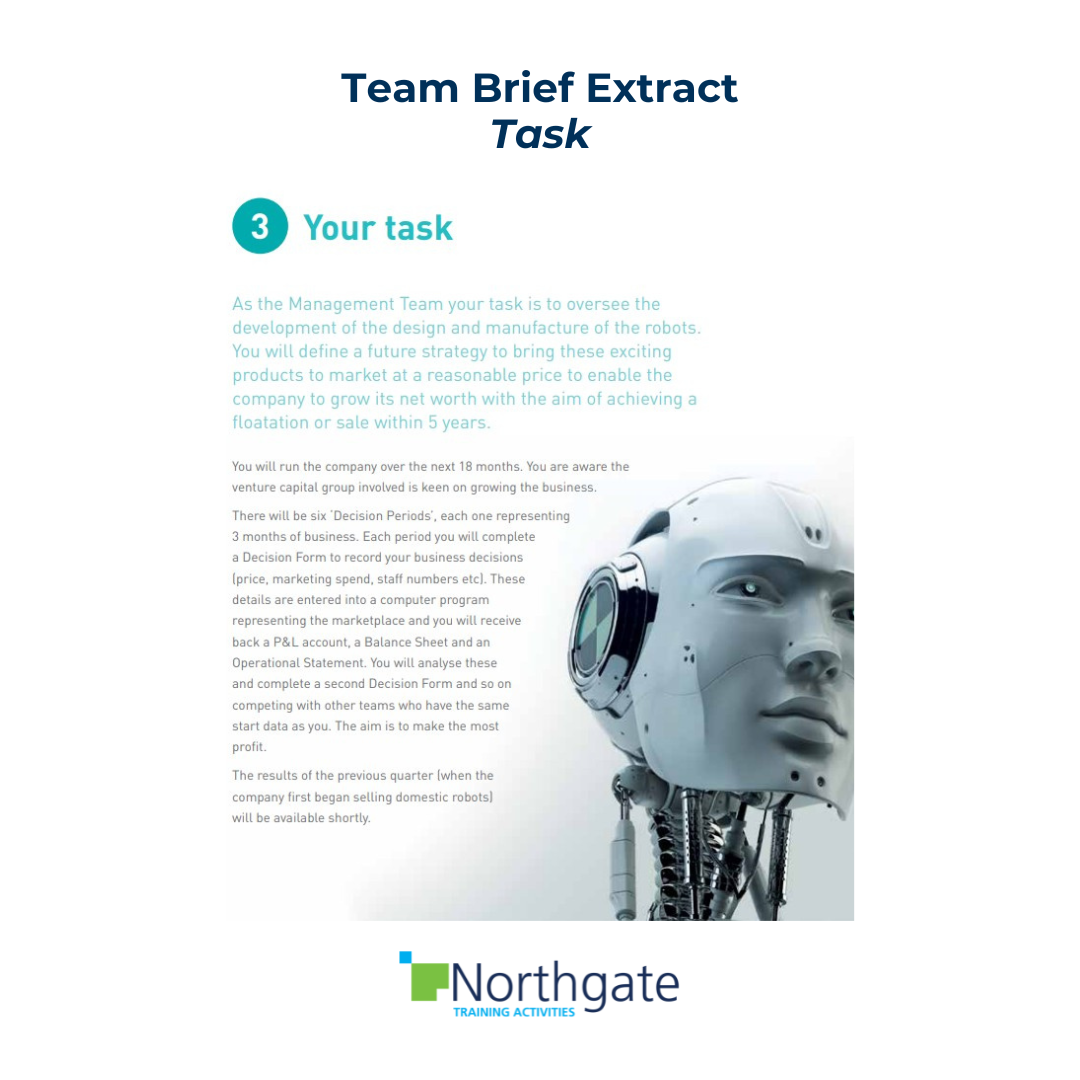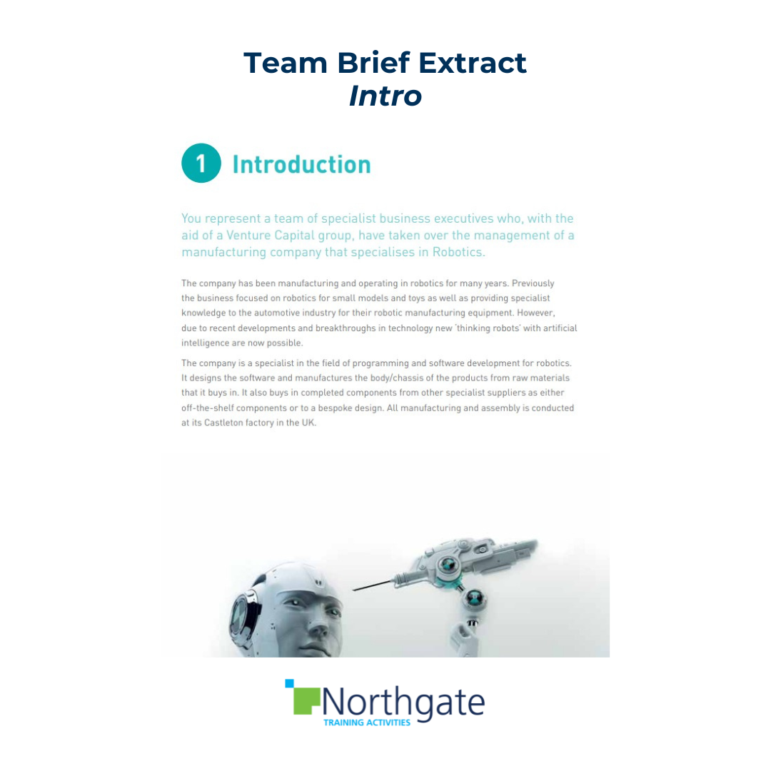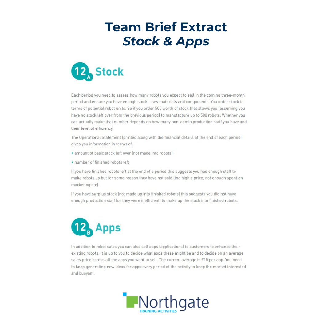 There are also optional business situations to discuss (they are thought provoking and good for discussion at the end but don’t actually influence the results). Other issues do have an effect. For example, cultural differences mean that the raw materials vary according to the region for which robots are being built. So robots are ‘region specific’. Teams also have the opportunity to extend the business by supplying apps for customers to enhance their existing robots.