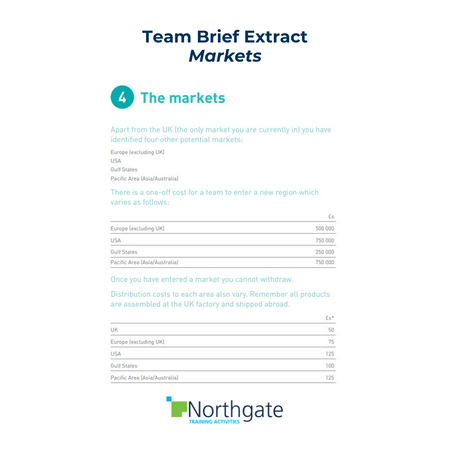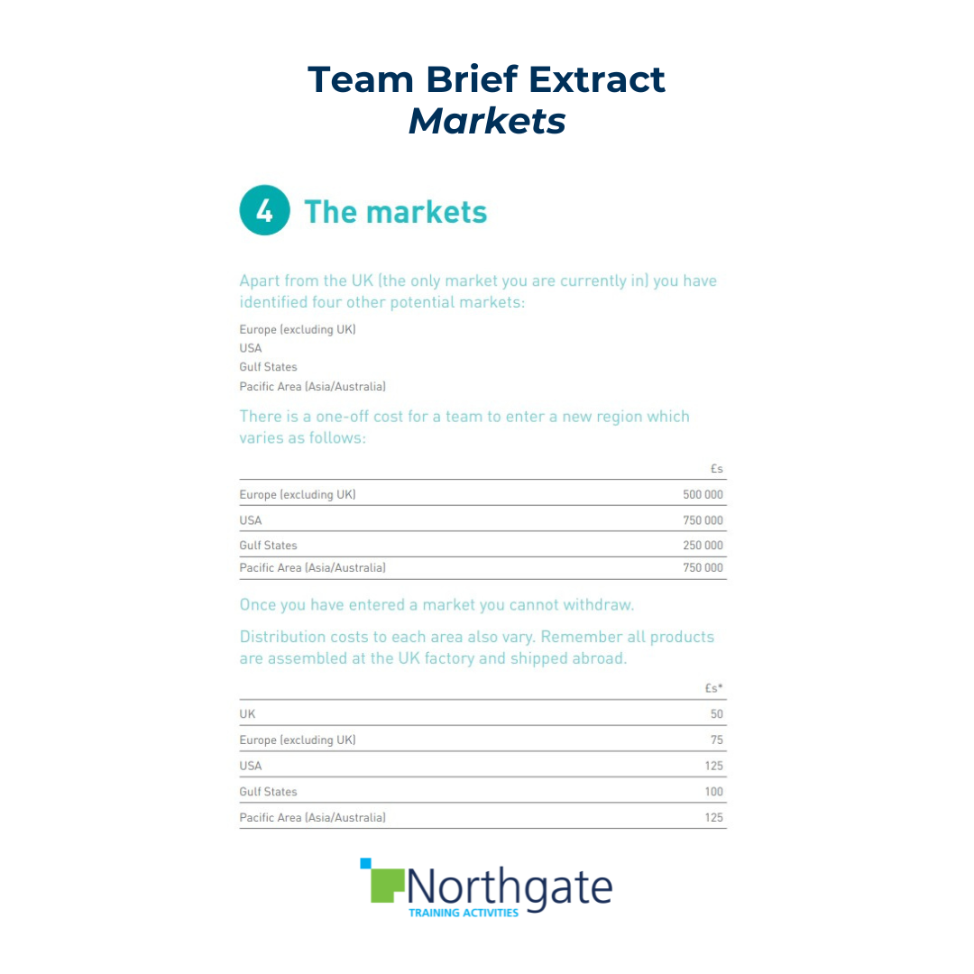 - Issue each team with a Decision Form on which teams record their decisions for the first quarter: prices, staff numbers, markets, salaries, advertising spend etc.
