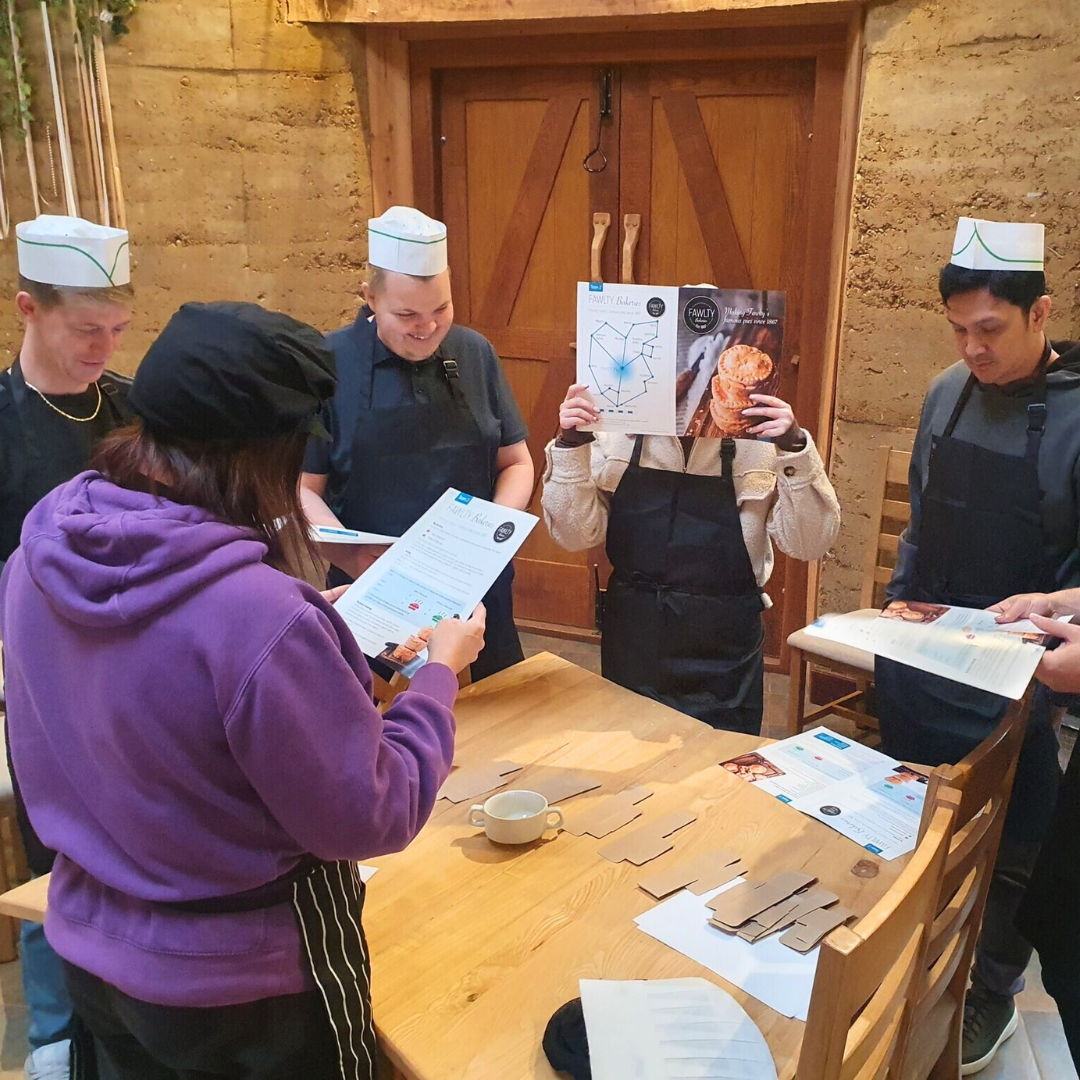 In this teamwork training activity, A Taste of Teamwork, two teams jointly represent the "Packing & Despatch Department" of a bakery supplying pies to retail outlets. (If running it with 13-24 delegates, you would have x2 lots of two teams - making four teams in total). The task involves ordering different kinds of pies from the baking department, processing customer orders, invoicing and packing up the orders, ready for despatch.