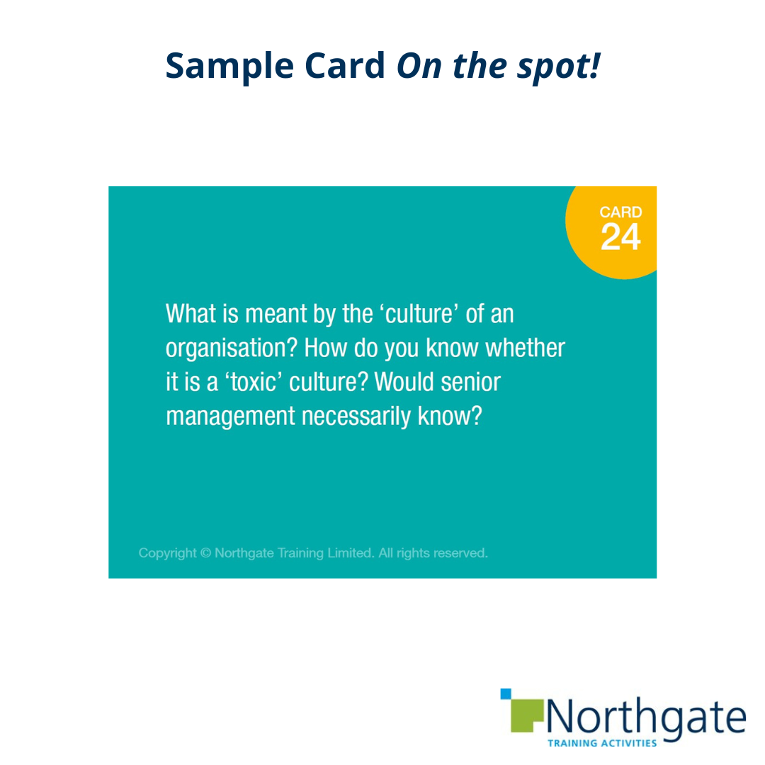 When time is up the cards are discussed at the debrief, ideas are shared and correct responses, where applicable, are revealed. During this process, the key learning points are extracted. The Trainer's Notes contain a commentary for each card and there is an optional, debrief PowerPoint.