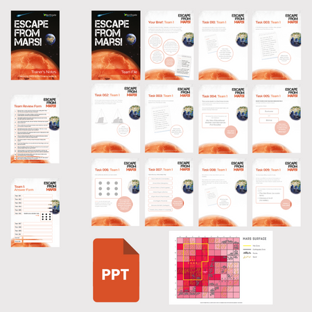 With a Mars chart and segments of information to piece together, teams must first pinpoint the Escape Pod. To gain entry they need to find a Key Code. They must also construct a Mars Rover (face-to-face) or 'assemble' a four-part transponder (virtual) (each team has details of one part) and complete 10 tasks.