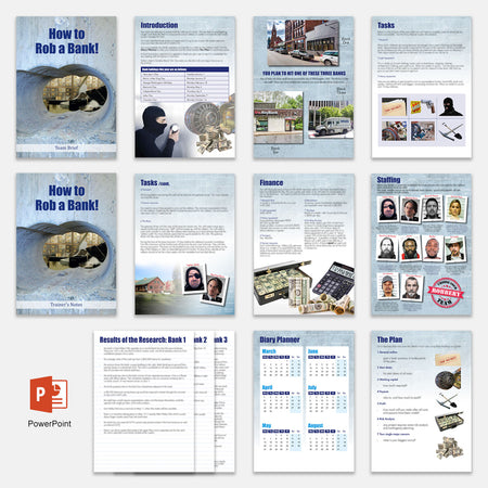 At the start of the activity teams have already commissioned research on three likely banks. Armed with a diary, teams decide on which bank to go for and then plan their heist. They have already recruited a getaway driver, but they need a base from which to work from and to practice with the equipment before the robbery. A certain Mr Big will bankroll the project but he'll want his money back plus a cut of the loot. So teams have to calculate all the costs and come up with a profitable, viable plan. Obviously there are risks and these need to be identified and assessed.