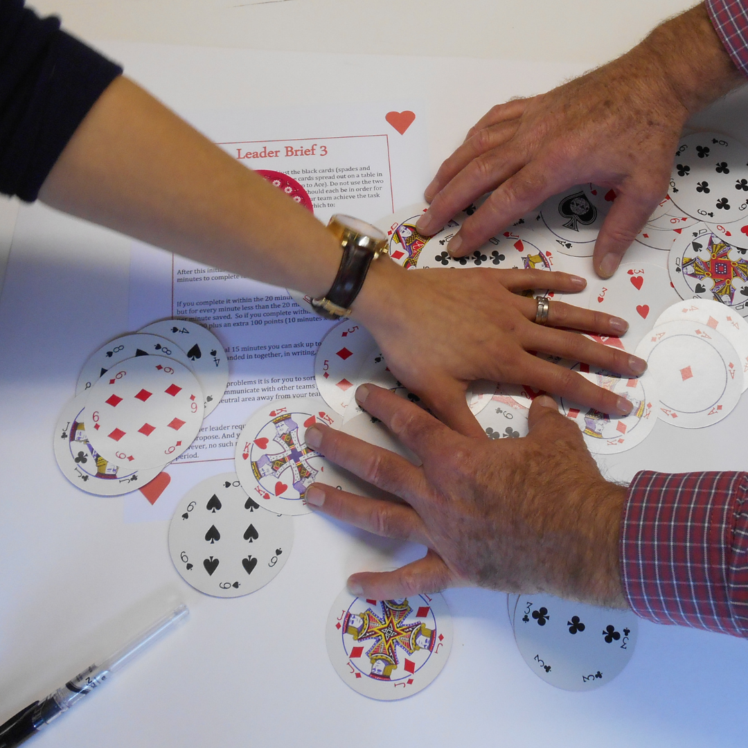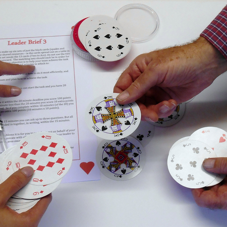 On a nearby table in the training room you should place the six packs of circular playing cards – all packs randomly mixed up together but there is just one card missing (all explained in the Trainer’s notes). These constitute the shared resources with which each team needs to fulfill its particular task.