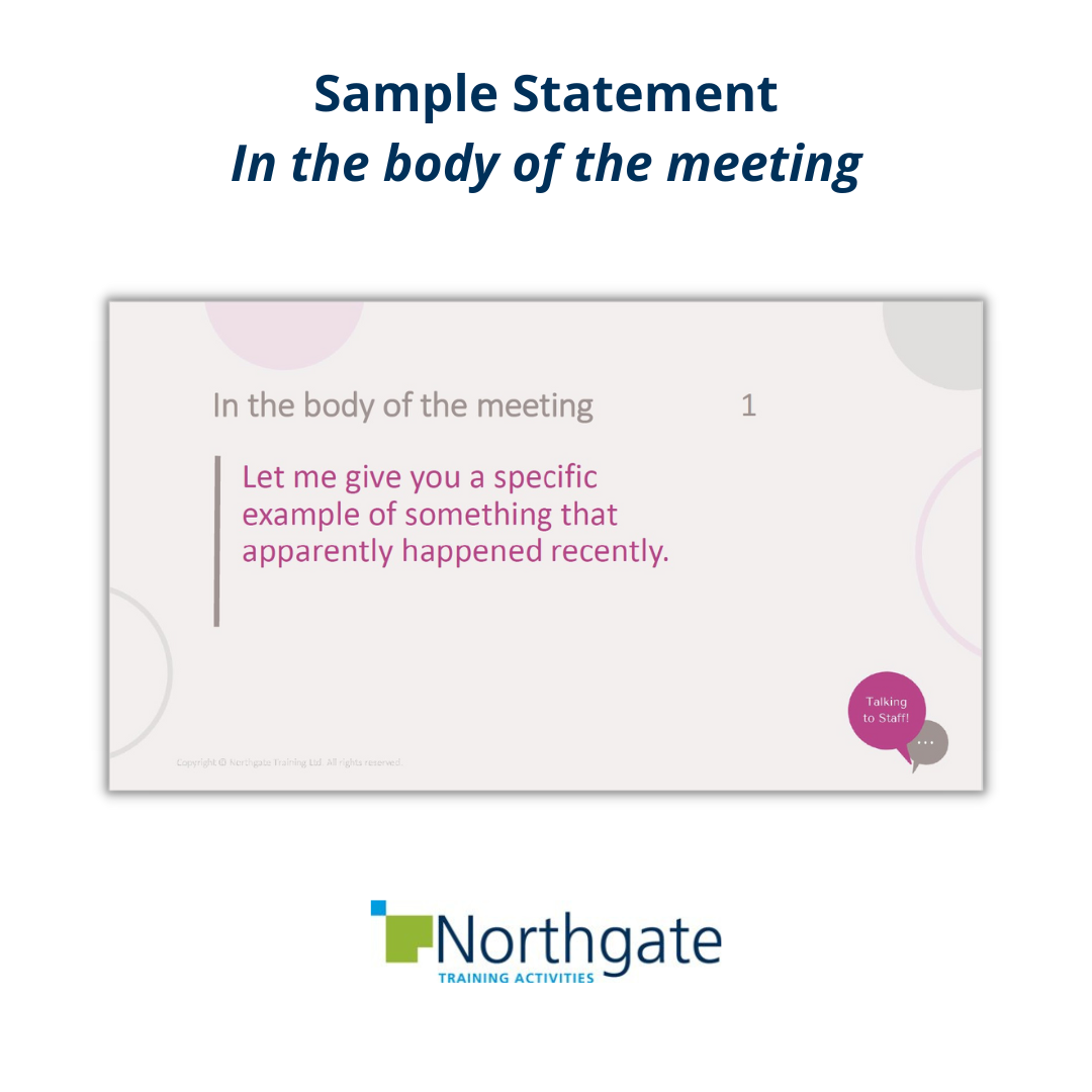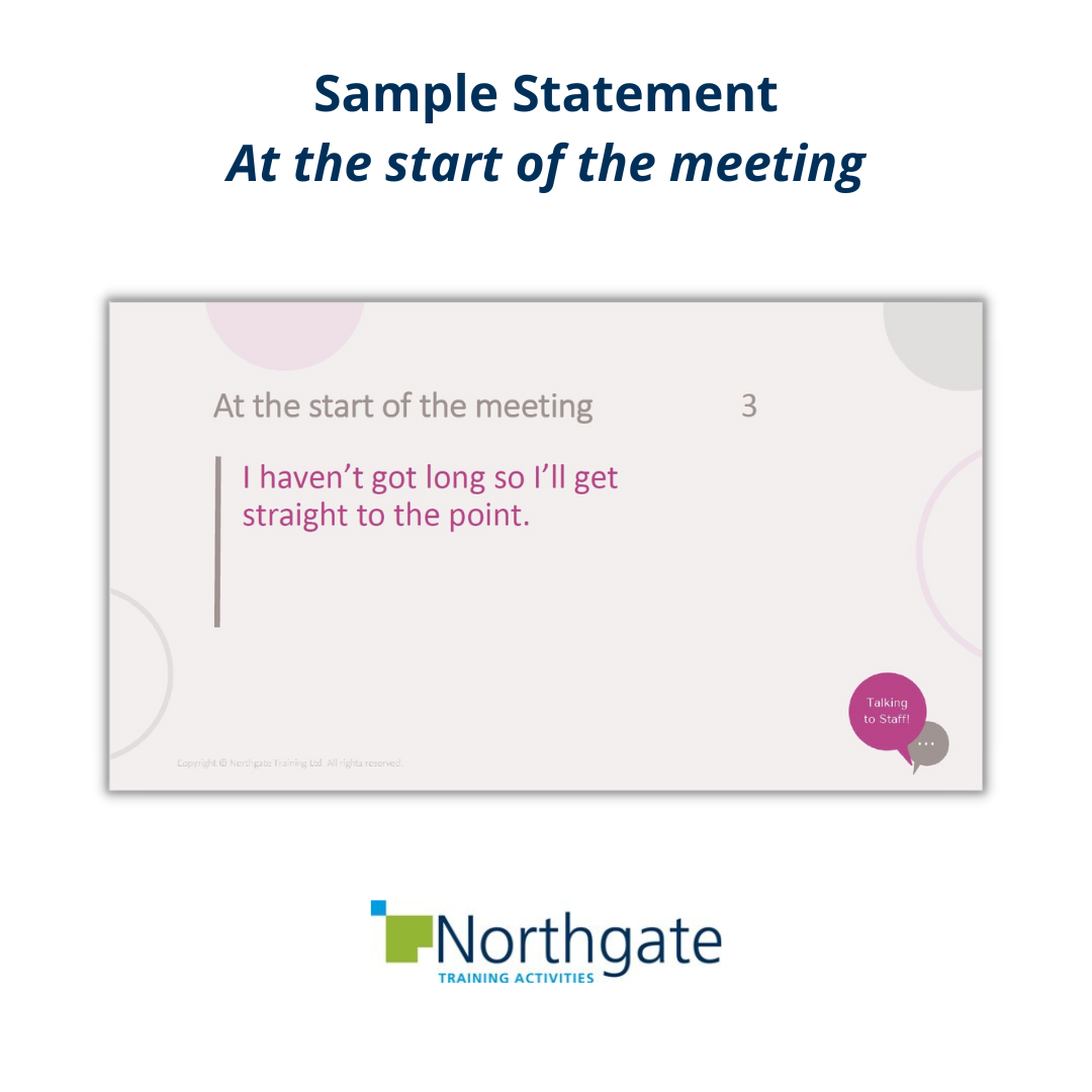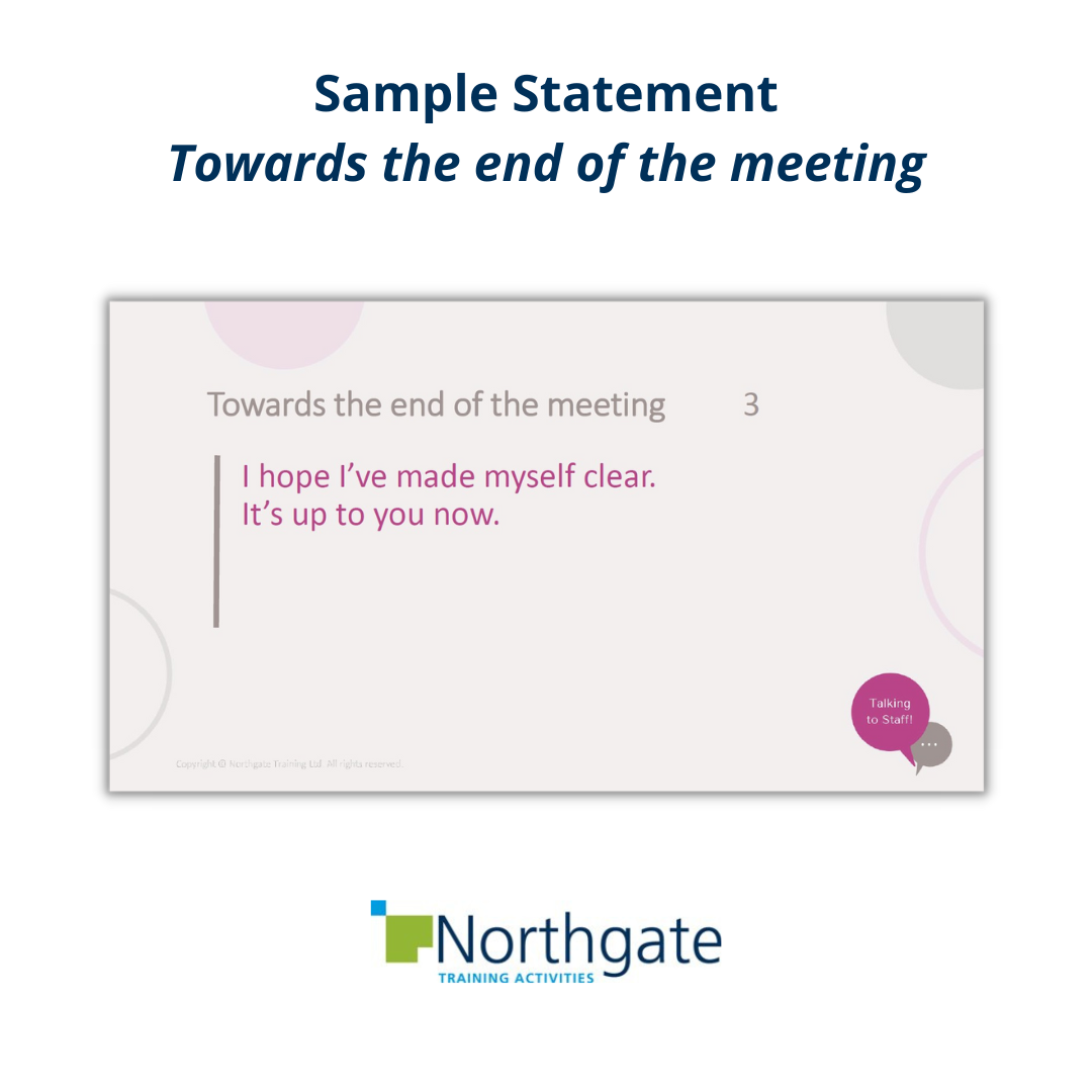 Next teams work through a set of 30 Statements, considering the type of language to use and scoring each statement (0, 1 or 2) as to how appropriate they think they are. The debrief follows, where teams explain the rationale for their plans and consider the statement scores. Here the learning points emerge. The Trainer's Notes includes a brief commentary on the statements and a Sample Meeting. To conclude participants receive a Key Points Handout. During the debrief, it is worth going through each point and relating it back to the teams' plans.