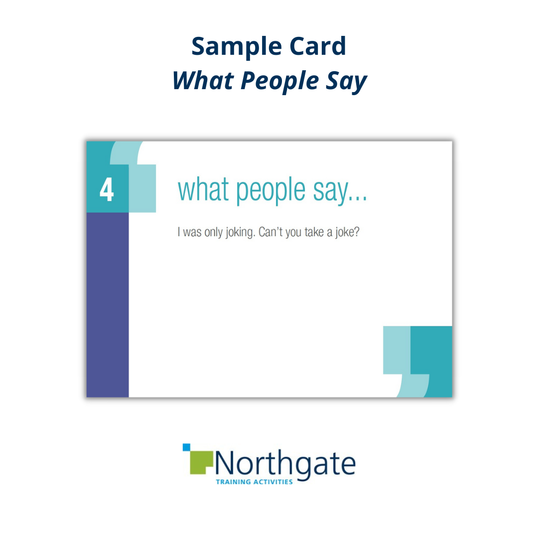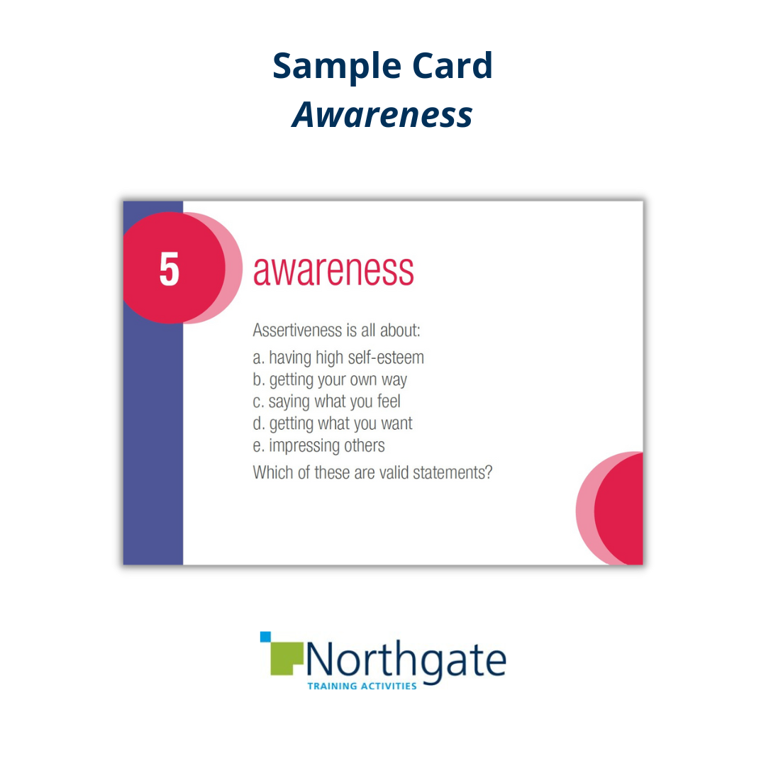 - What People Say Cards: teams share views and decide whether quotes taken from workplace situations are assertive, non-assertive, passive-aggressive or aggressive.